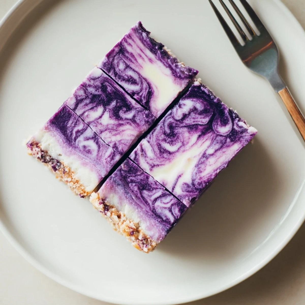 These elegant layered bars combine three distinct textures and flavors into one stunning dessert. The foundation features a crunchy blend of raw cashews, shredded coconut, and sweet Medjool dates, pressed into a firm crust. A silky cashew cream layer, enriched with coconut cream and pure maple syrup, creates a smooth and velvety middle. The crowning touch is a vibrant blueberry swirl, made by cooking fresh or frozen berries until they burst and thicken, then marbling it through the cream. After freezing for at least three hours, the bars become firm and slice cleanly, revealing their beautiful purple streaks. Serve them chilled for the best texture, or let them thaw slightly for a creamier bite. They're naturally vegan, gluten-free, and perfect for make-ahead entertaining.