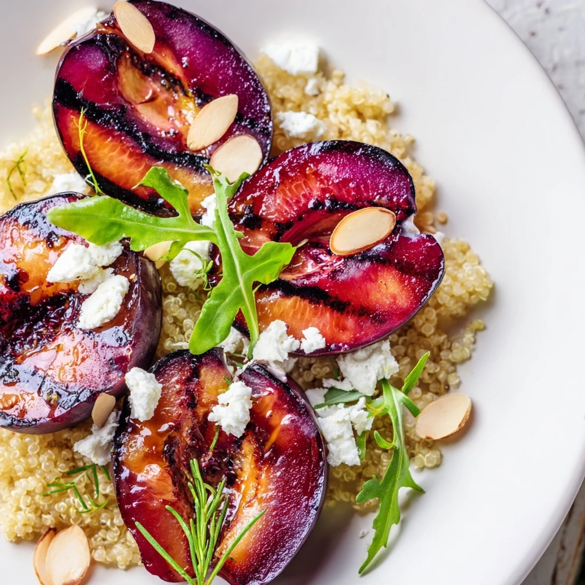 This vibrant grain salad combines the smoky-sweet flavors of grilled plums with fragrant fresh rosemary and nutty quinoa. Perfect for warm weather dining, it brings together peppery arugula, crunchy toasted almonds, and a tangy balsamic-honey dressing that ties all the elements together.