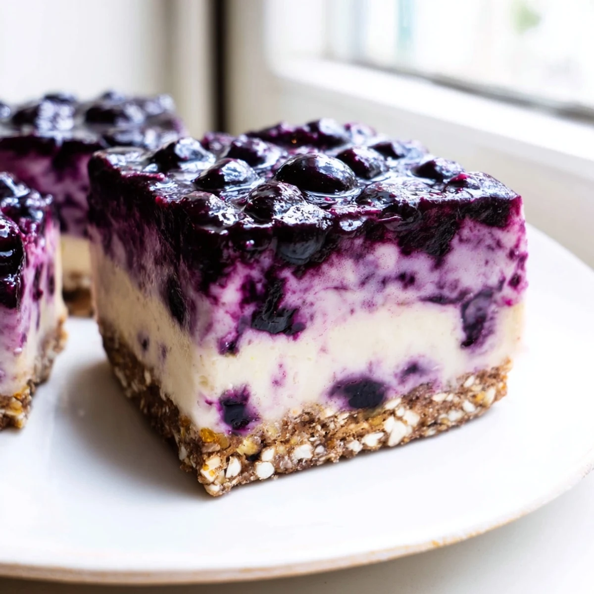 What makes these squares special is their no-bake nature and impressive presentation. The creamy cashew layer develops its luxurious texture through soaking and blending, while the blueberry topping adds a beautiful purple contrast and fresh fruit flavor. They're perfect for summer entertaining when you want something impressive but refreshing.