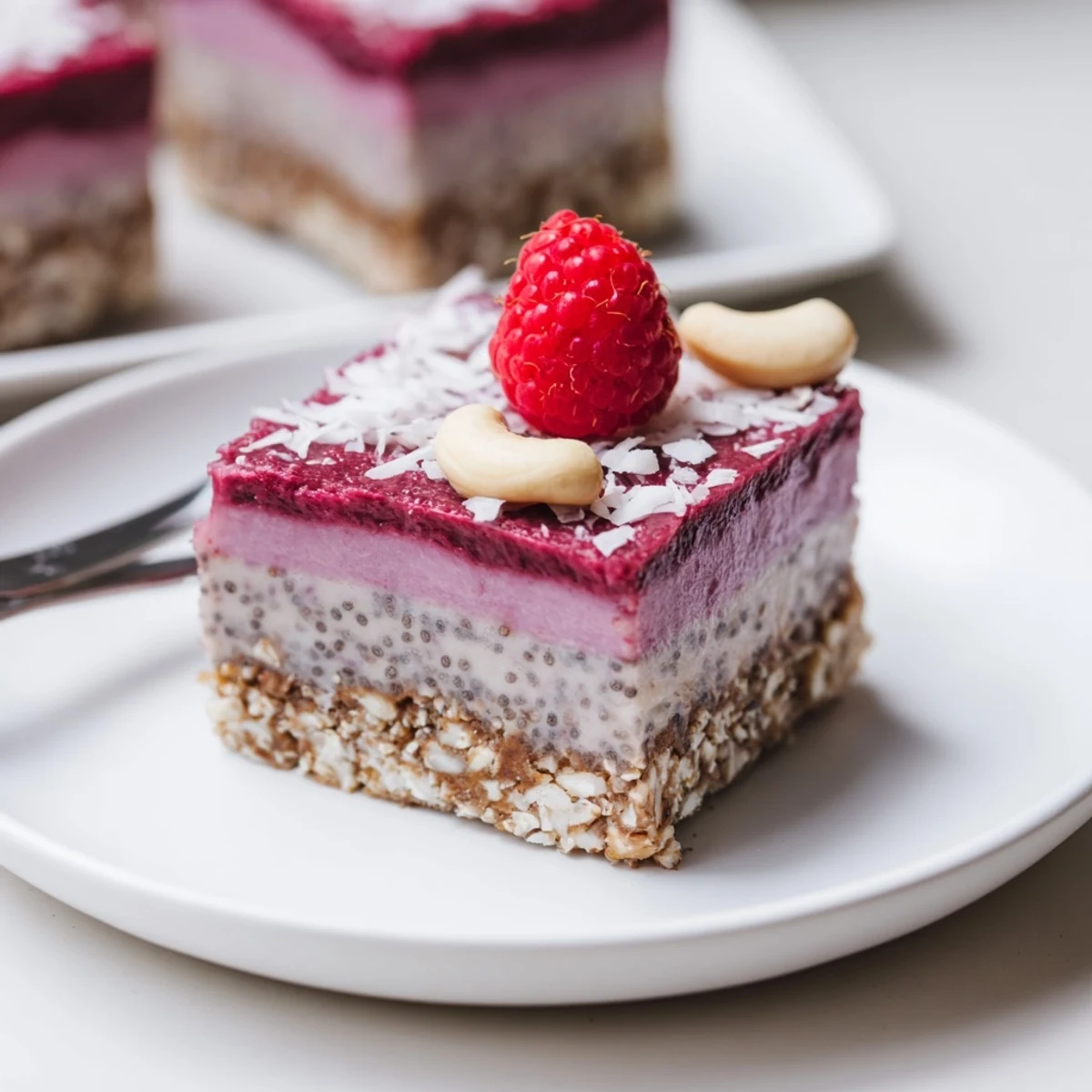 These no-bake bars layer a chewy date-and-nut base, a silky coconut-cashew cream and a bright raspberry chia topping. Soak cashews for a velvety texture and blend until utterly smooth, press the base firmly, then spread the cream and top with the raspberry mix. Freeze until fully set, thaw briefly before slicing. Yields about 12 bars; swap seeds to make a nut-free base.