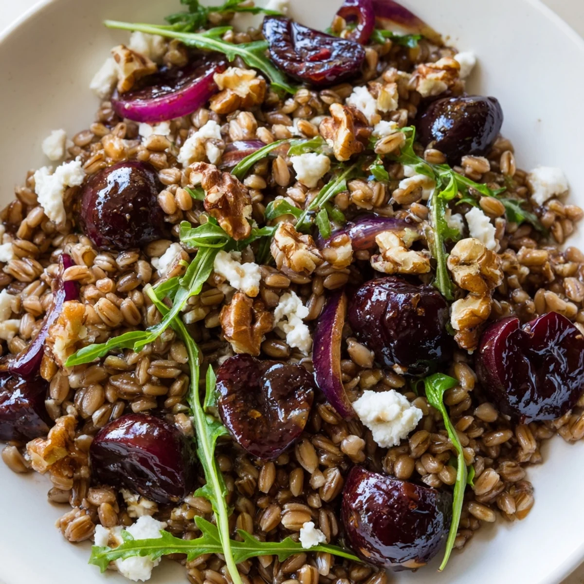 This vibrant grain bowl combines nutty farro with naturally sweet roasted cherries for a perfect balance of flavors. The roasted fruit brings caramelized depth while the tangy balsamic dressing ties everything together beautifully. Fresh arugula adds peppery bite, toasted walnuts provide satisfying crunch, and creamy feta offers a rich finish. Ready in about an hour, this versatile dish works wonderfully as a light lunch, impressive side dish, or base for grilled proteins. Serve slightly warm or at room temperature to let the flavors shine.