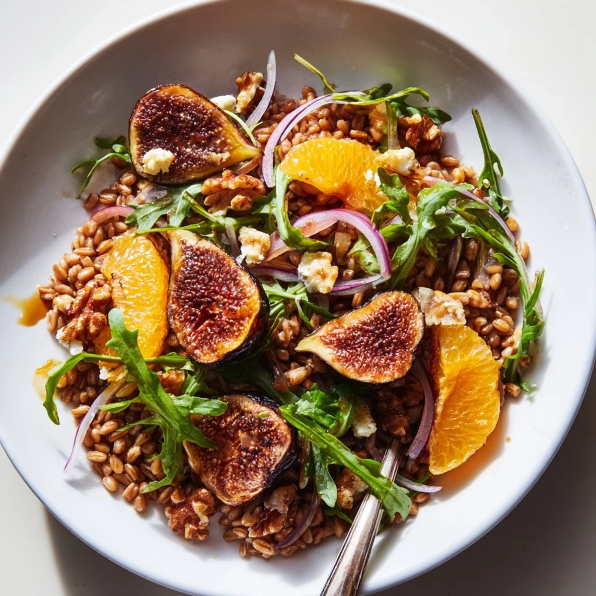 - In a large bowl, pile in the cooled farro, arugula, orange segments, roasted figs, red onion, and walnuts, then pour the dressing over and toss gently so the figs stay intact.