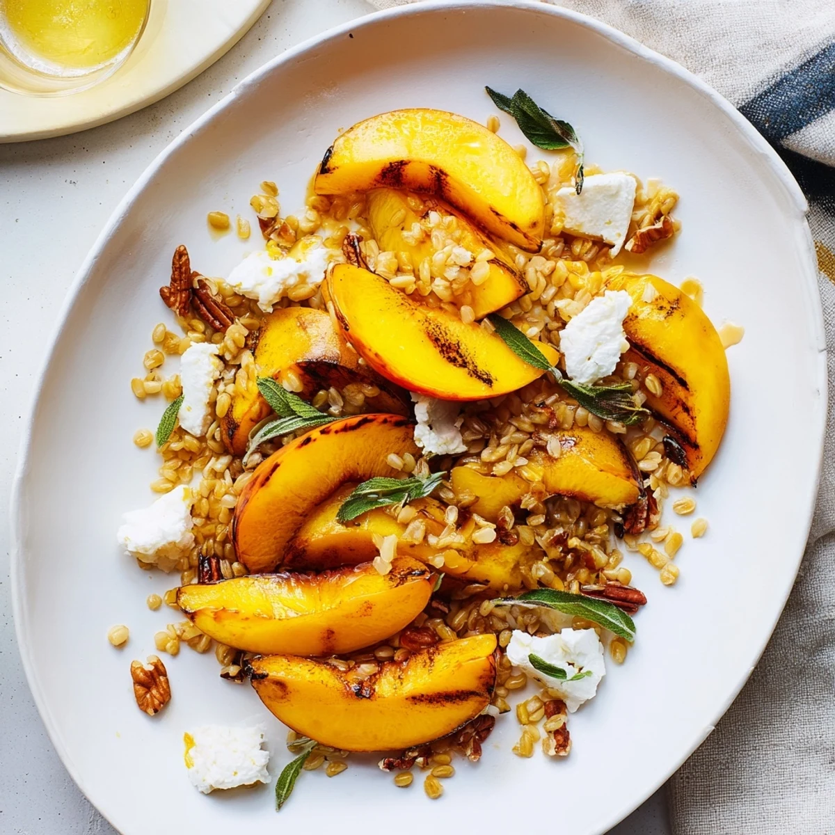 The preparation comes together in under an hour—simply simmer the farro until chewy, roast peach wedges until golden and slightly caramelized, then toss with fresh ingredients and finish with the emulsified vinaigrette. The warm fruit contrasts beautifully with cool greens, while the grain base makes it substantial enough for a satisfying lunch.
