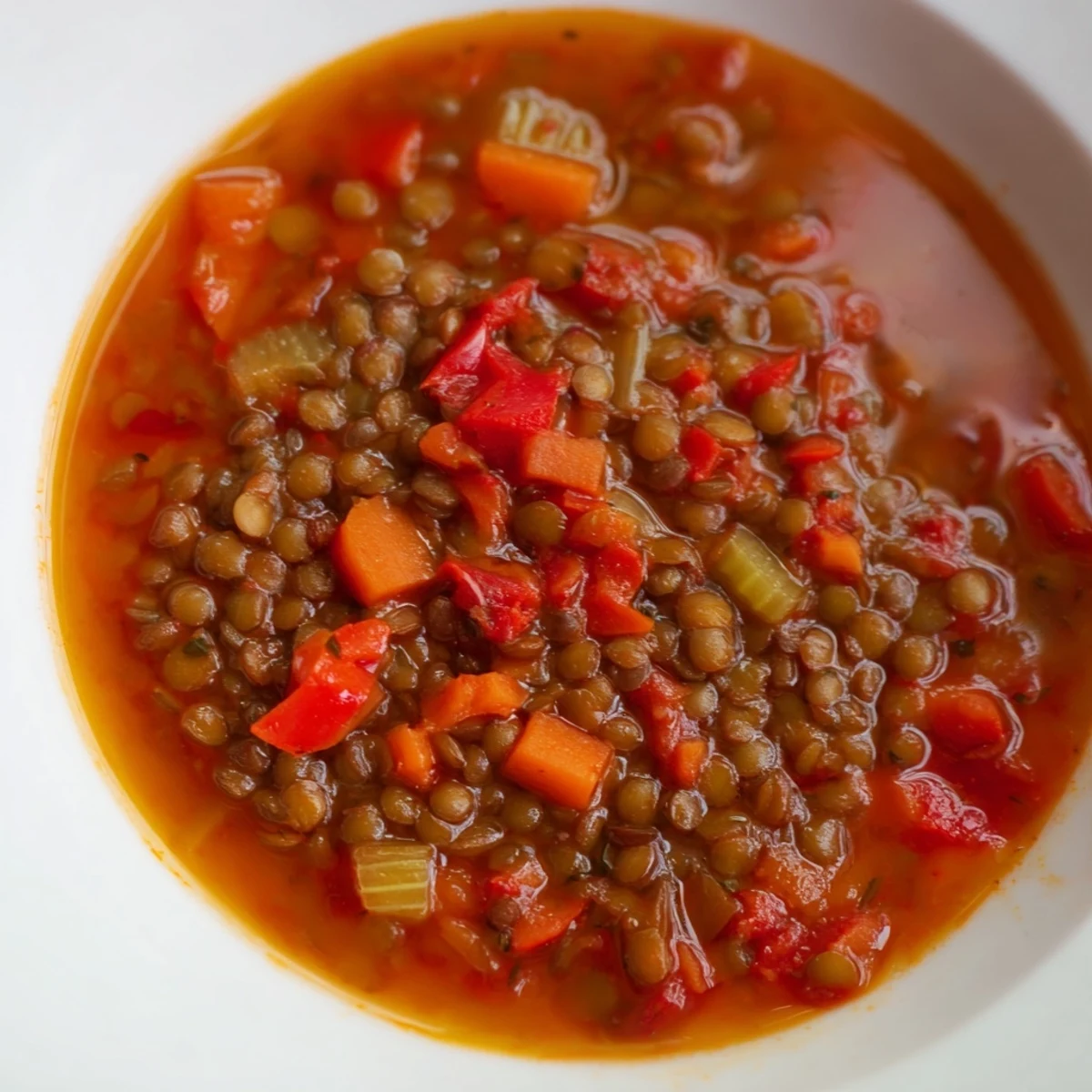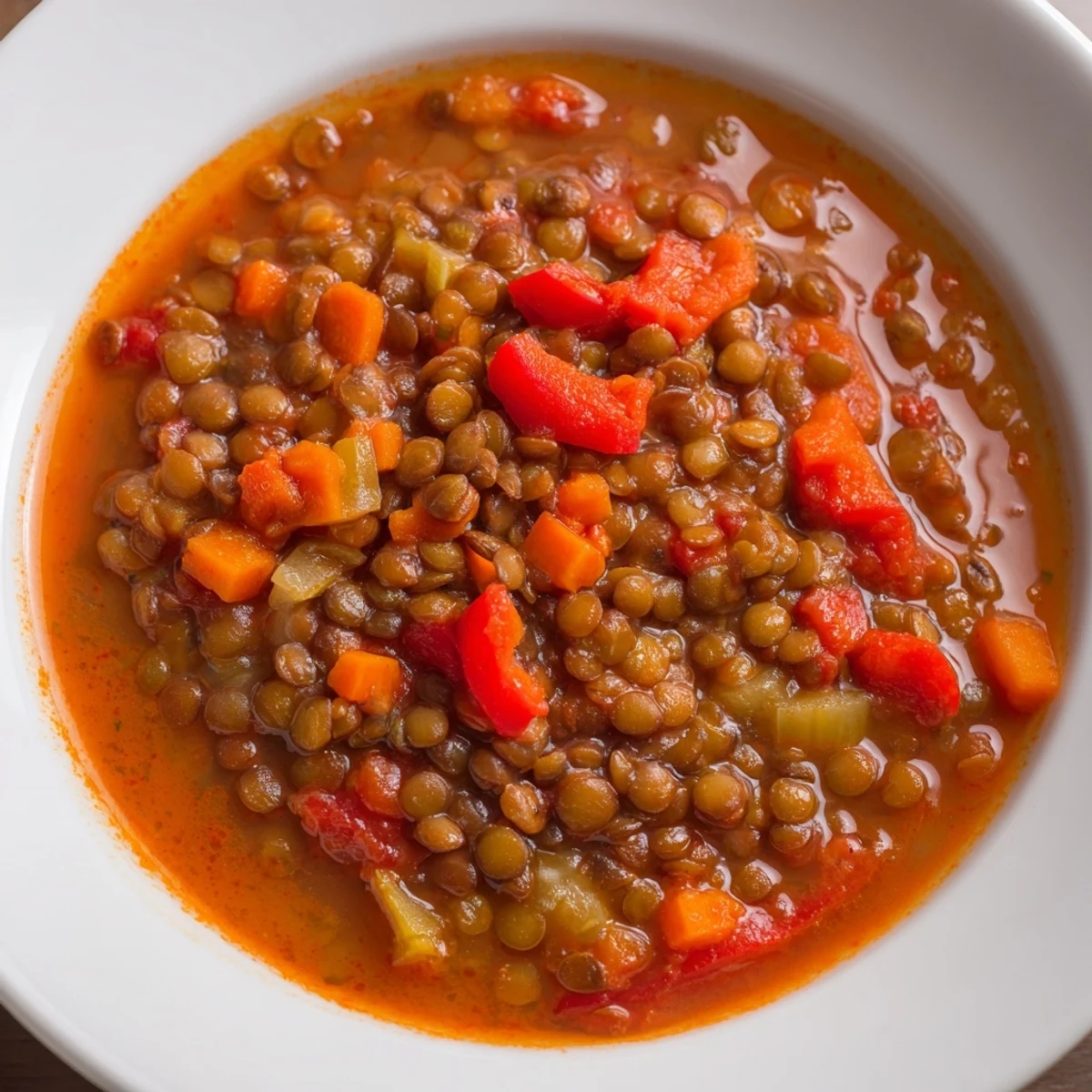 This satisfying bowl combines earthy brown lentils with naturally sweet charred red peppers, creating depth through smoked paprika and cumin. The aromatic base of sautéed onions, carrots, and celery builds classic flavor foundations while garlic adds warmth. Simmered in vegetable broth until thickened, each spoonful delivers protein-rich comfort with vibrant color and satisfying texture. A splash of lemon brightens the smoky notes, while fresh parsley garnish adds herbal freshness. Ideal for meal prep and freezes beautifully for future meals.