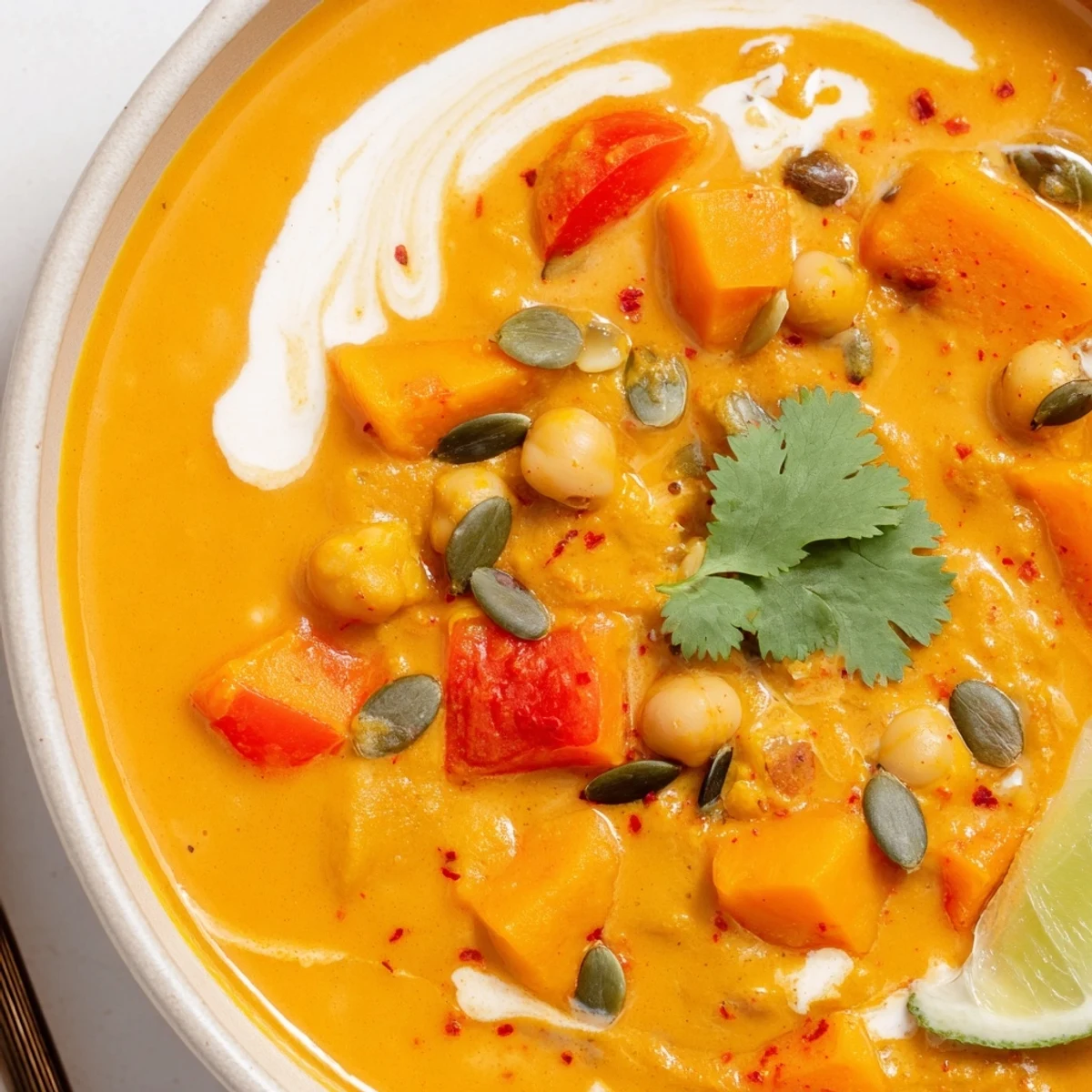 This creamy, plant-based bowl starts by softening onion, garlic and ginger in olive oil, then sautéing pumpkin, carrot and bell pepper until edges begin to brown. Toast cumin, coriander, turmeric and smoked paprika to deepen flavor, then add chickpeas, coconut milk and vegetable broth and simmer 20 minutes until squash is very tender. Blend partially for a lumpy texture or fully for silkier mouthfeel. Finish with cilantro, toasted seeds and a lime squeeze; leftovers keep well refrigerated for 3–4 days.