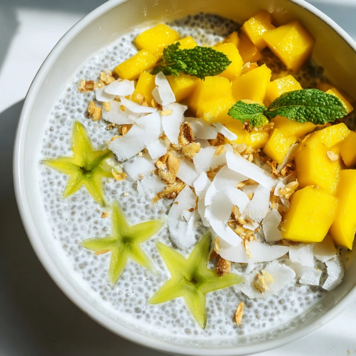 This vibrant morning bowl brings together the tropical sweetness of starfruit and ripe mango over a luscious coconut chia pudding base. The chia seeds gel overnight in creamy coconut milk with vanilla, creating a thick, pudding-like consistency that's perfectly balanced with fresh fruit. Toasted coconut flakes and pumpkin seeds add satisfying crunch, while fresh mint leaves brighten each spoonful.